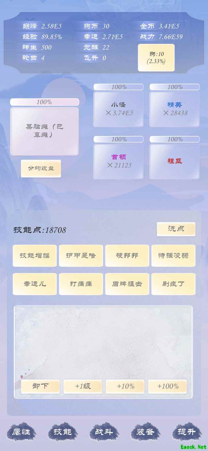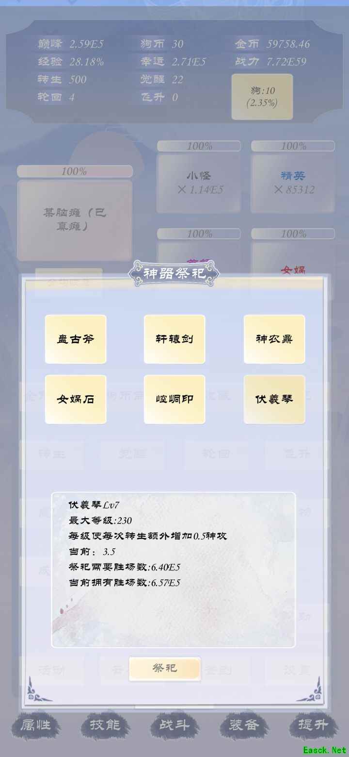 下一阶段开始注重幸运属性,优先提升一级神器伏羲琴,为转生做准备。幸运值可增加怪物数量,平衡幸运与难度以获取更高经验,待等级达到一百后继续下一步计划。