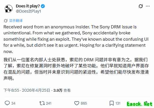 此前,外网消息源透露,目前PlayStation在PS4和PS5的数字版游戏中加入了DRM验证(正版在线验证)机制。