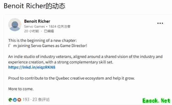 然而在一则新的 LinkedIn 动态中,Richer表示自己已经离开育碧,加入独立新工作室 Servo Games,也不再参与《女巫》的开发。而就在两个月前,本作的创意总监、曾参与《细胞分裂》系列的 Clint Hocking 也已离职。