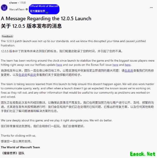 《魔兽世界》更新翻车:暴雪官方紧急致歉!