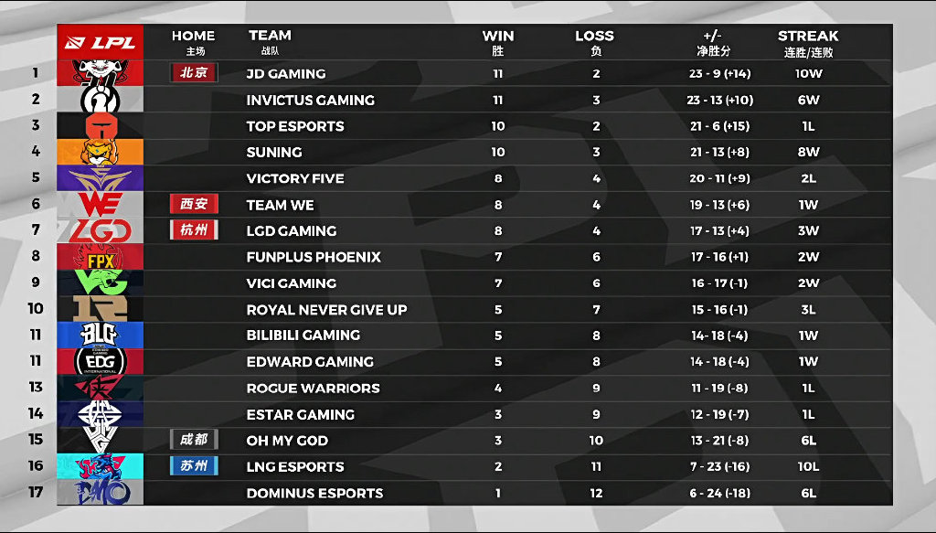 首先前三名JDG、IG、TES都超过10的积分,还剩下两三场比赛,比赛压力不会很大,基本上稳定进入季后赛前五了,可以开始季后赛B05的准备了。JDG、IG、TES大概率是能拿到S10名额的队伍,春季赛有积分,夏季赛成绩不错,最差的也可以通过冒泡赛来拿到S10名额。