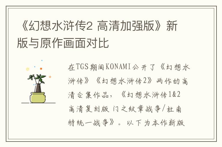 在TGS期间KONAMI公开了《幻想水浒传》《幻想水浒传2》两作的高清合集作品,《幻想水浒传1&2 高...