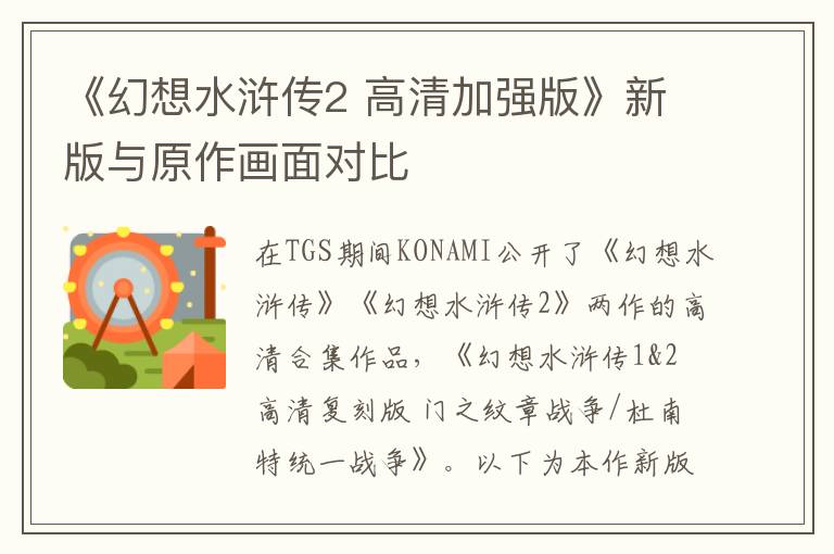 在今年东京电玩展上,科乐美正式公布了《幻想水浒传1&2 高清复刻合集》,这是时隔多年后,《幻...