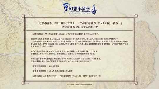 - 《幻想水浒传1&2 HD合集》宣布延期 新发售日期待定