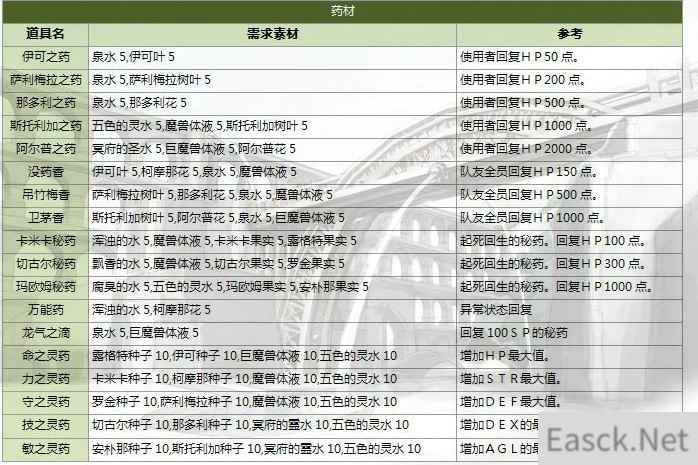 全灵药制作素材:对于想嗑药喂出一个999的玩家建议选择挂机打素材,毕竟所有的药都是可以制作的...