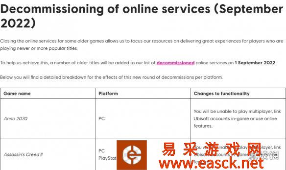 根据育碧官网公告,为了能专注于新游戏及受欢迎的游戏,2022年9月1日起将关闭15款老游戏的在线功...