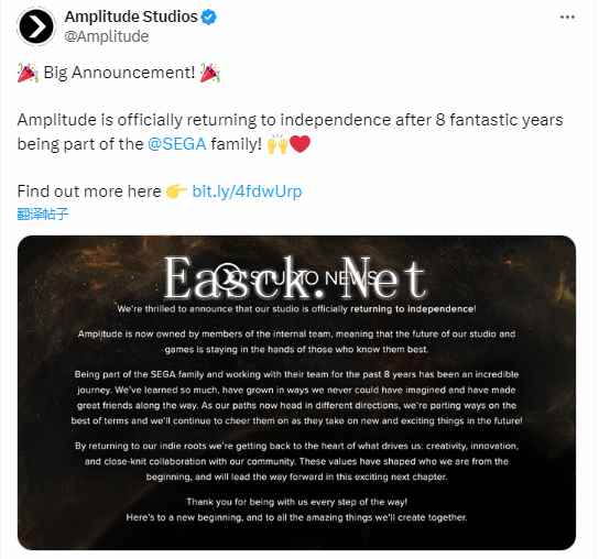 世嘉子公司Amplitude Studios工作室(《无尽空间》《无尽地牢》)今日宣布,正式脱离世嘉回归独立...
