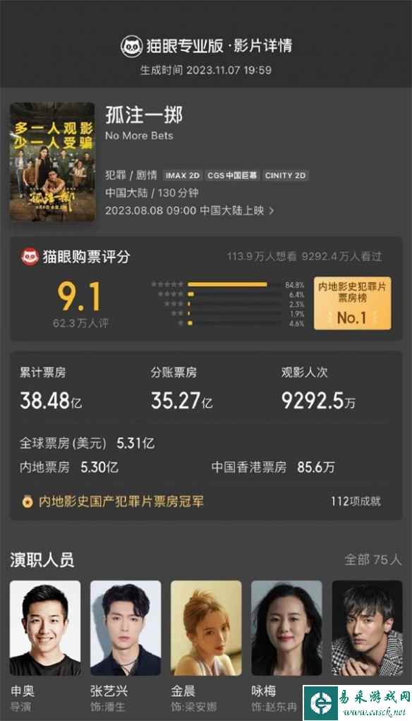 根据猫眼专业版数据,《孤注一掷》于11月7日圆满落幕,总票房高达38.48亿,有9292.5万人次观影...