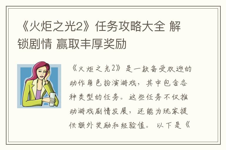 《火炬之光2》是一款备受欢迎的动作角色扮演游戏,其中包含各种类型的任务。这些任务不仅推动...