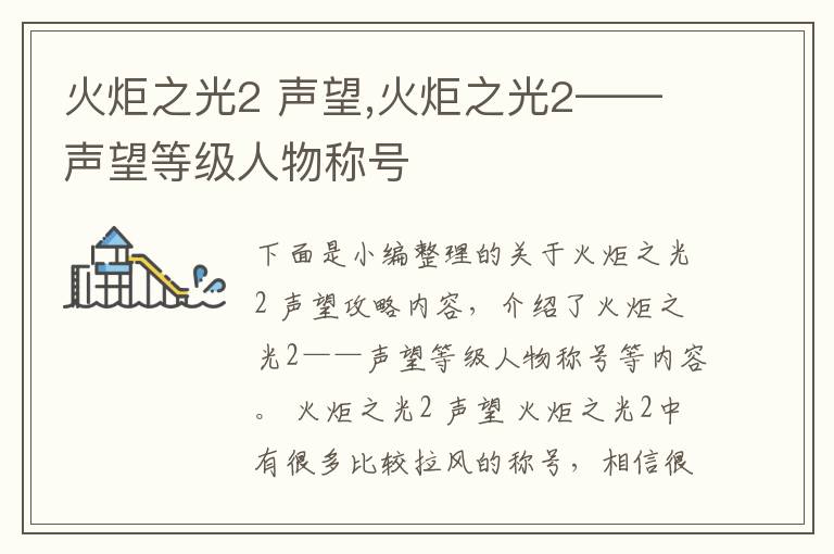 下面是小编整理的关于火炬之光2 声望攻略内容,介绍了火炬之光2——声望等级人物称号等内容。 ...