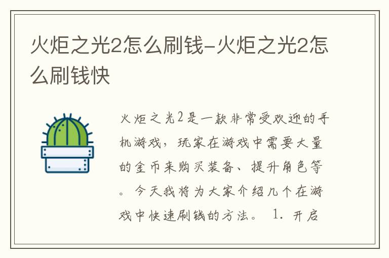 火炬之光2是一款非常受欢迎的手机游戏,玩家在游戏中需要大量的金币来购买装备、提升角色等。...