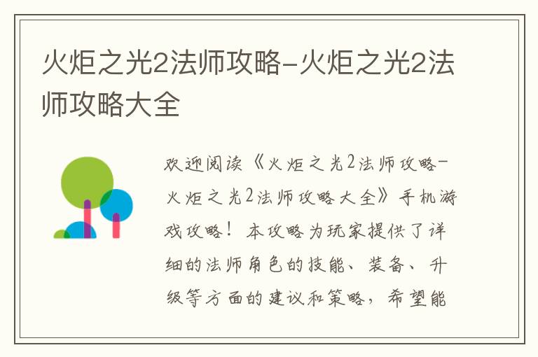 欢迎阅读《火炬之光2法师攻略-火炬之光2法师攻略大全》手机游戏攻略!本攻略为玩家提供了详细...