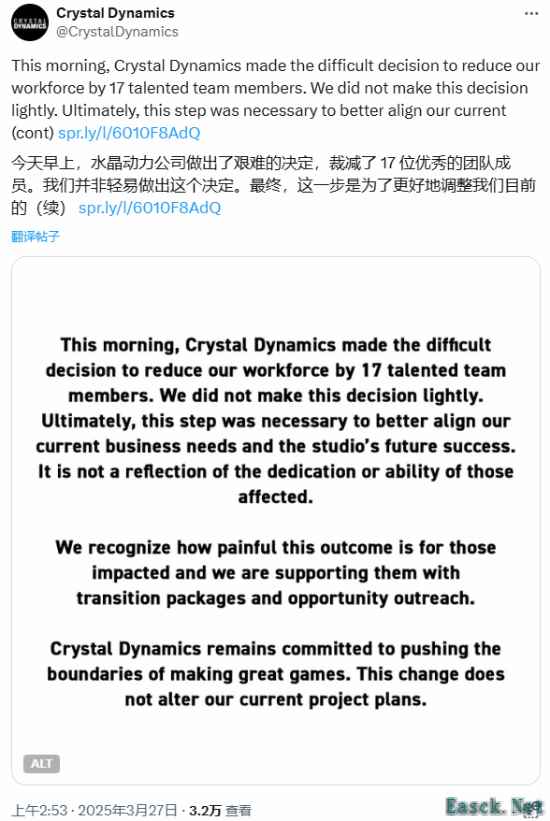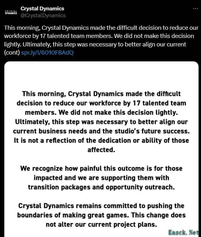 曾开发古墓丽影等多款经典游戏的 Crystal Dynamics 工作室今日发布了一则声明,宣布裁减了17名...