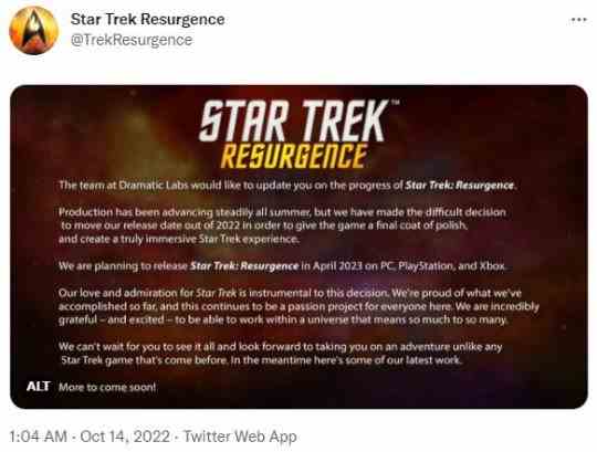 近日,叙事冒险游戏《星际迷航:复苏》发布延期公告,该作原定于2022年年内发售,现已延期至2023...