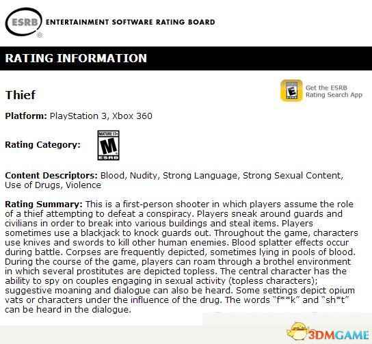 - ESRB评《神偷4》为成人级 暴力血腥偷窥妓院XO