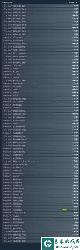 《模拟人生4》Steam资料片、扩充包、组合、套件包等DLC国区售价迎来永降,幅度在10元至50...