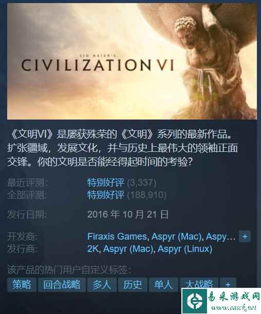 - Steam每日特惠:《文明6》1折 《神力科莎》只要14元