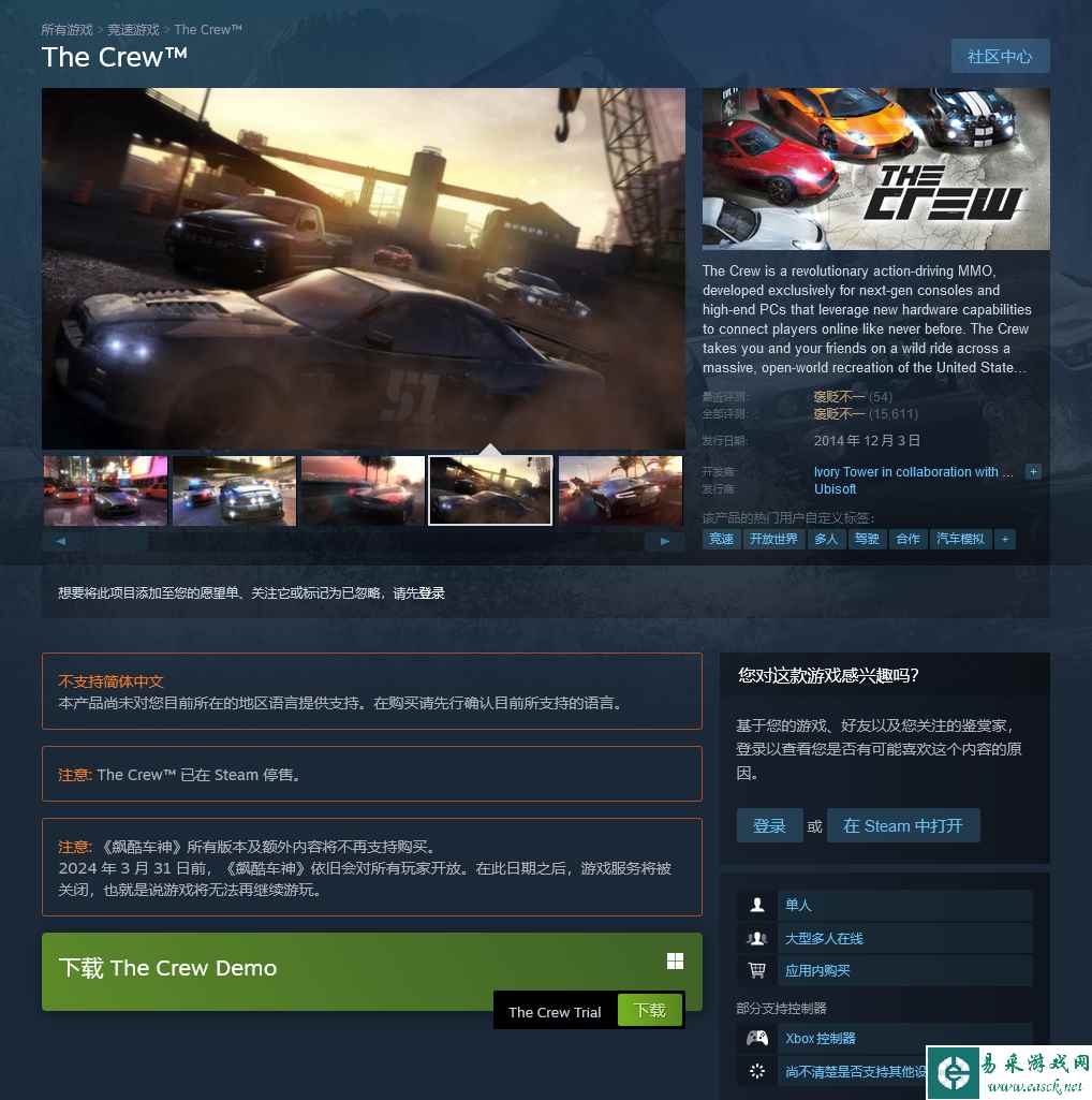 育碧打造的多人竞速游戏《飙酷车神》初代作品,与2014年12月面世,并在今年3月底彻底关闭服务器...