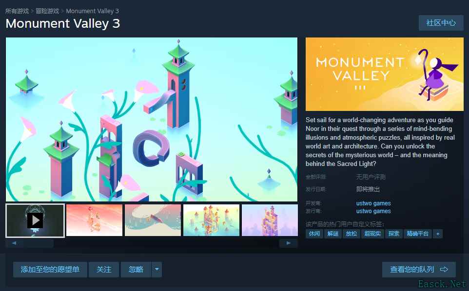 - 《纪念碑谷3》Steam页面上线,支持中文