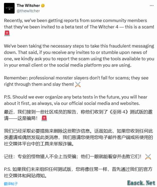 - 《巫师4》Beta测试邀请被官方证实为骗局