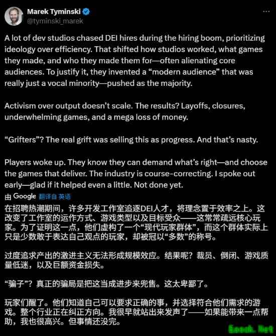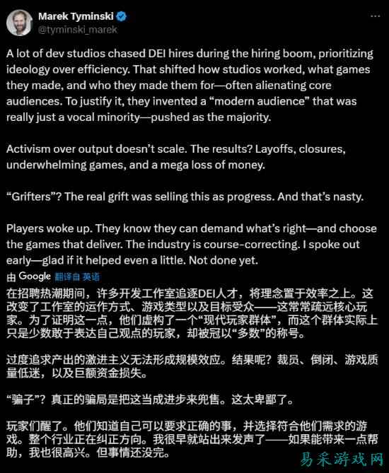 《堕落之主》发行商CI Games的CEO Marek Tyminski在推特发表了一篇动态,怒斥那些过度追求DEI...