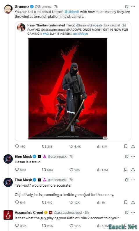 今日,马斯克和育碧在社交媒体上发生了争执。起因是一位博主Grummz转发了一条关于《刺客信条:影...