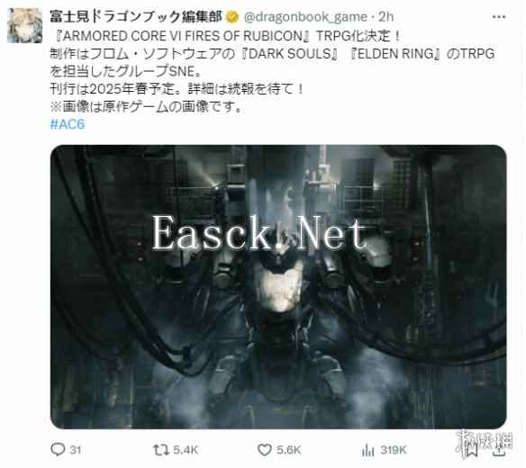 角川旗下的富士見ドラゴンブック宣布,《装甲核心6》将被改编为TRPG,由制作《黑暗之魂》《...