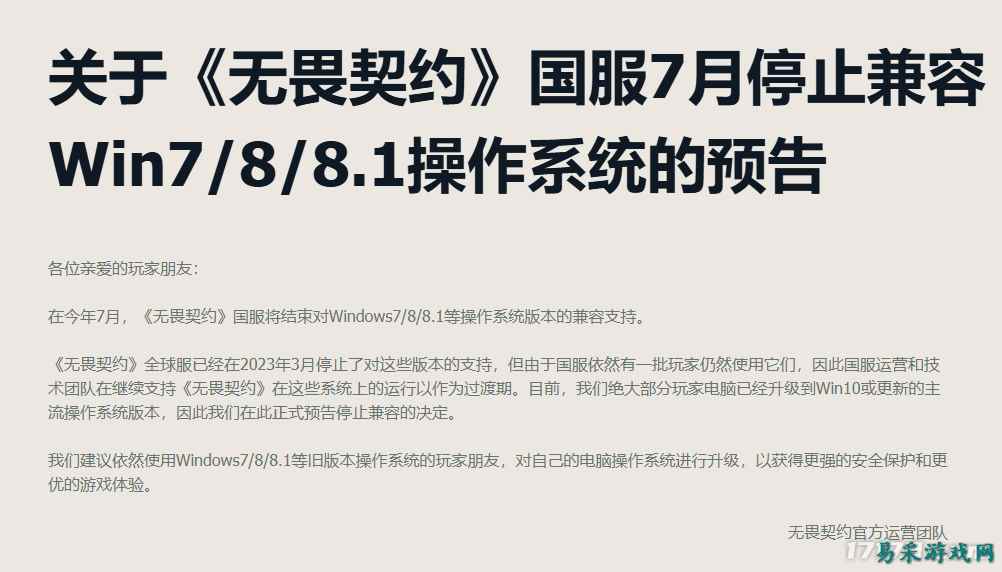 腾讯近日宣布,无畏契约国服将于今年7月起停止对Windows 7、8及8.1等操作系统版本的技术支持。...