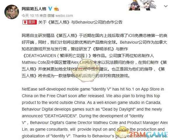 今日网易《第五人格》手游官方微博宣布与《黎明杀机》开发商Behaviour公司达成合作,Behaviour...