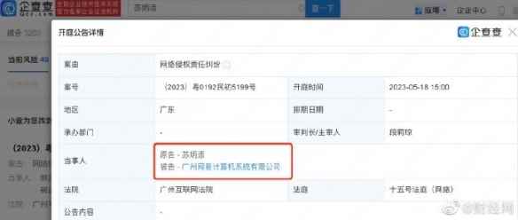 企查查显示,苏炳添起诉广州网易计算机系统有限公司侵权,案件将于5月18日在广州互联网法院...