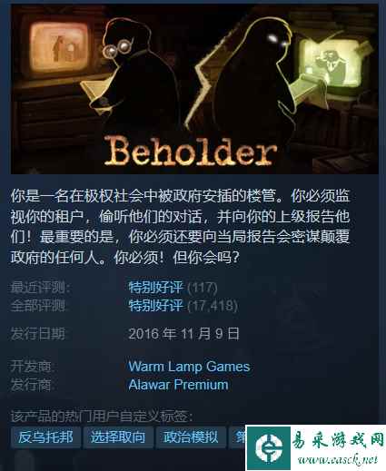 《旁观者(Beholder)》是由Warm Lamp Games制作,Alawar Entertainment发行的一款独立类型的策略冒险游戏,玩家将扮演一名十分变态的房东,需要通过各种各样的手段监
