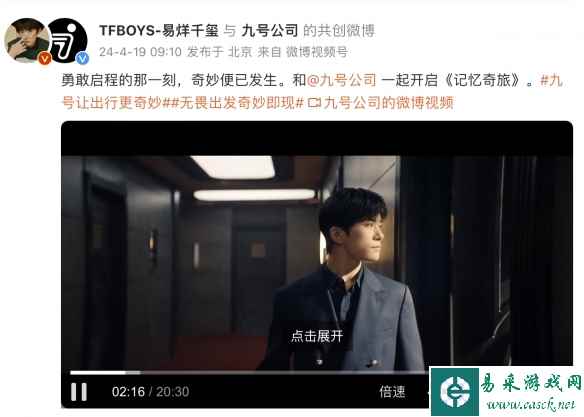 4月19日,九号公司携手易烊千玺演绎的微电影《记忆奇旅》上映,该微电影仅4天内网络播放次数...