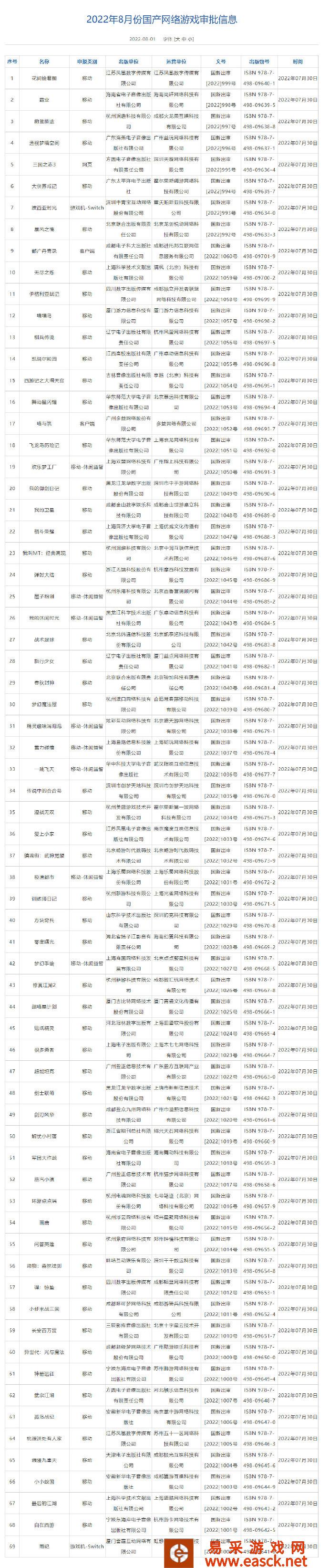 国家新闻出版署公布了2022年8月过审网络游戏名单,共计69款,其中64款为移动端游戏,一款网页...