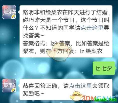 龙族幻想2019年8月8日微信每日一题的问题是:路明非和绘梨衣在昨天进行了结婚,碰巧昨天是一个节...