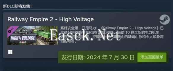 - 模拟游戏《铁路帝国2》新dlc“高压”将于7月30日发售