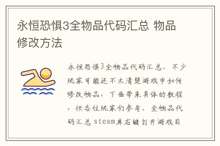 永恒恐惧3全物品代码汇总。不少玩家可能还不太清楚游戏中如何修改物品,下面带来具体的教程,供...