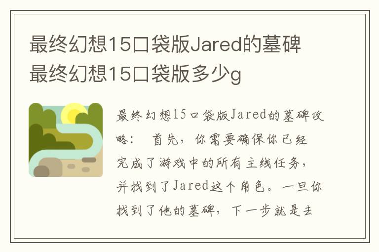最终幻想15口袋版Jared的墓碑攻略: 首先,你需要确保你已经完成了游戏中的所有主线任务,并找到...