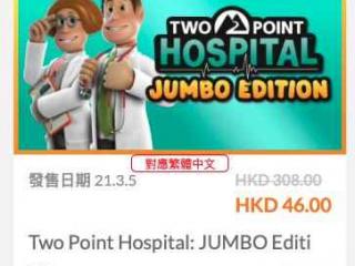 医院模拟游戏《双点医院 JUMBO Edition》目前在Switch港服开启1.5折促销,原价308港币,折后...
