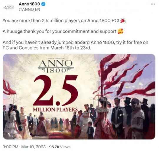 - 策划游戏《纪元1800》玩家数量突破250万 主机版3月16日上线