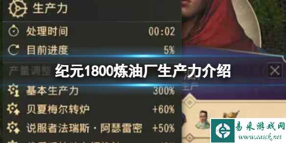 纪元1800炼油厂可以生产石油为机械厂和铁甲舰提供动力,炼油厂生产力在750%以上能达到1秒1桶油...