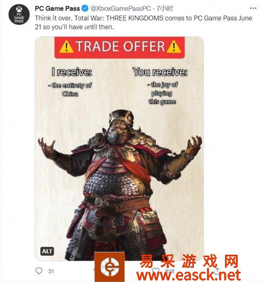 - 《全面战争:三国》6月21日加入PC Game Pass