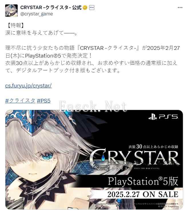 10 月 18 日,开发商 FuRyu 宣布动作角色扮演游戏《恸哭之星》(CRYSTAR)将于 2025 年 2 月 27 日...
