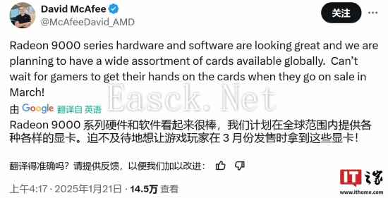 IT之家1月21日消息,AMD 公司副总裁兼客户渠道业务总经理 David McAfee 北京时间今日凌晨确认,R...