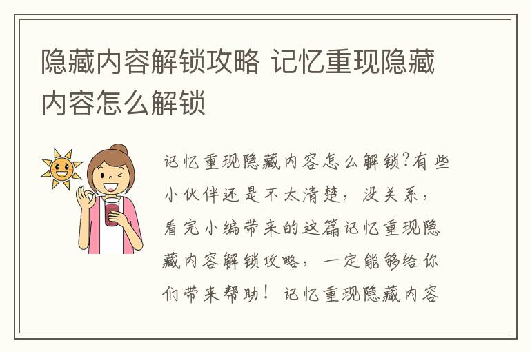 隐藏内容解锁攻略 记忆重现隐藏内容怎么解锁记忆重现隐藏内容怎么解锁?有些小伙伴还是不太清楚,没关系,看完小编带来的这篇记忆重现隐藏内...