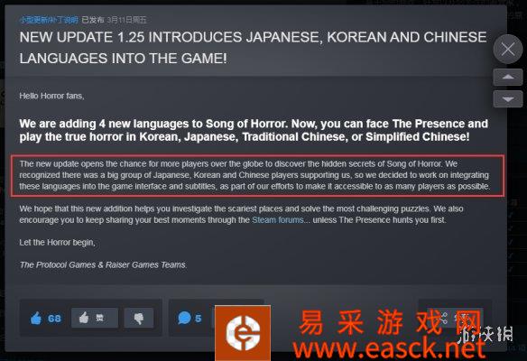 第三人称生存恐怖游戏《恐怖之歌》官方宣布,追加中文支持,该作目前开启了6折优惠活动,折后...