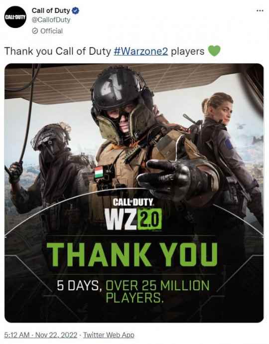 - 刚上线5天!《使命召唤:战区2》玩家数突破2500万人