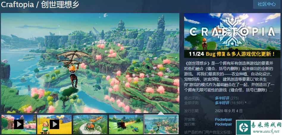 日本独立工作室POCKET PAIR旗下高自由度开放世界生存动作游戏《创世理想乡(Craftopia)》迎...