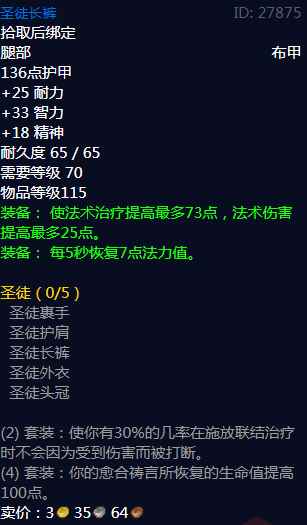 魔兽世界圣徒长裤是最近魔兽推出的70级tbc怀旧服的一件强力装备,很多玩家都对70得装备属性非...