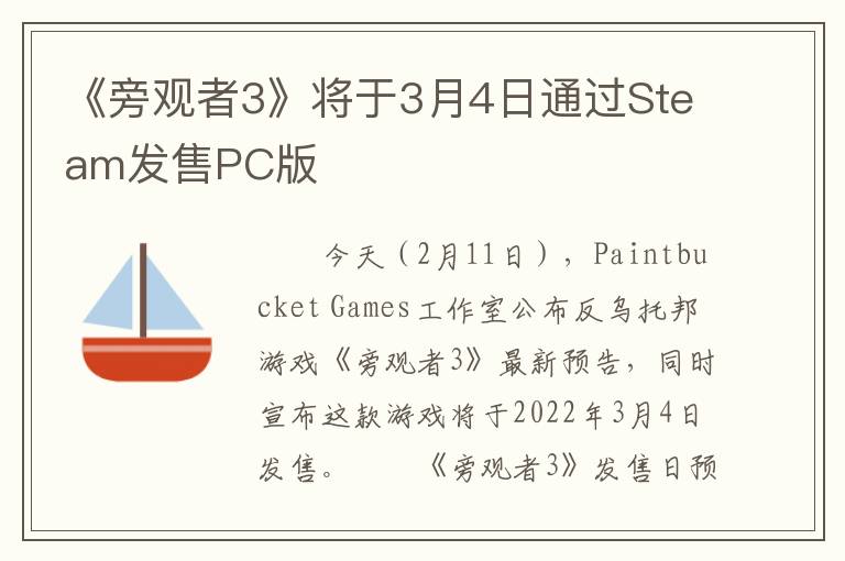 - 《旁观者3》将于3月4日通过Steam发售PC版