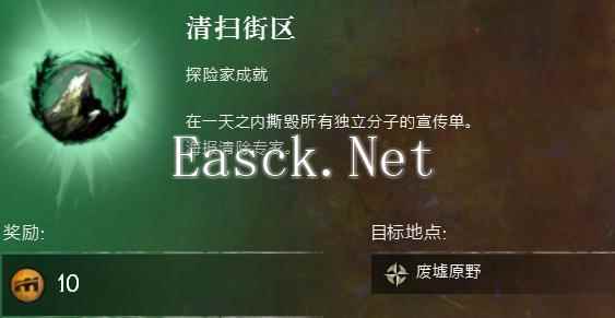 成就:清扫街区 该成就要求在一个游戏昼夜间,撕毁“黑檀鹰堡要塞”所有的独立者宣传单。 ...